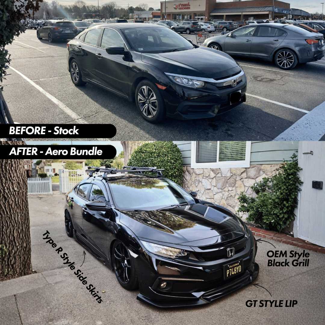 Our Full Aero Upgrade Bundle is your 10th Gen Civic's ticket from mild to merry mayhem. A full transformation that'll have you sleighing the competition and leaving stock Civics in your snow dust. Not only will your build look more aggressive, it'll perform better with more downforce. Ready to give your Civic the gift it deserves?